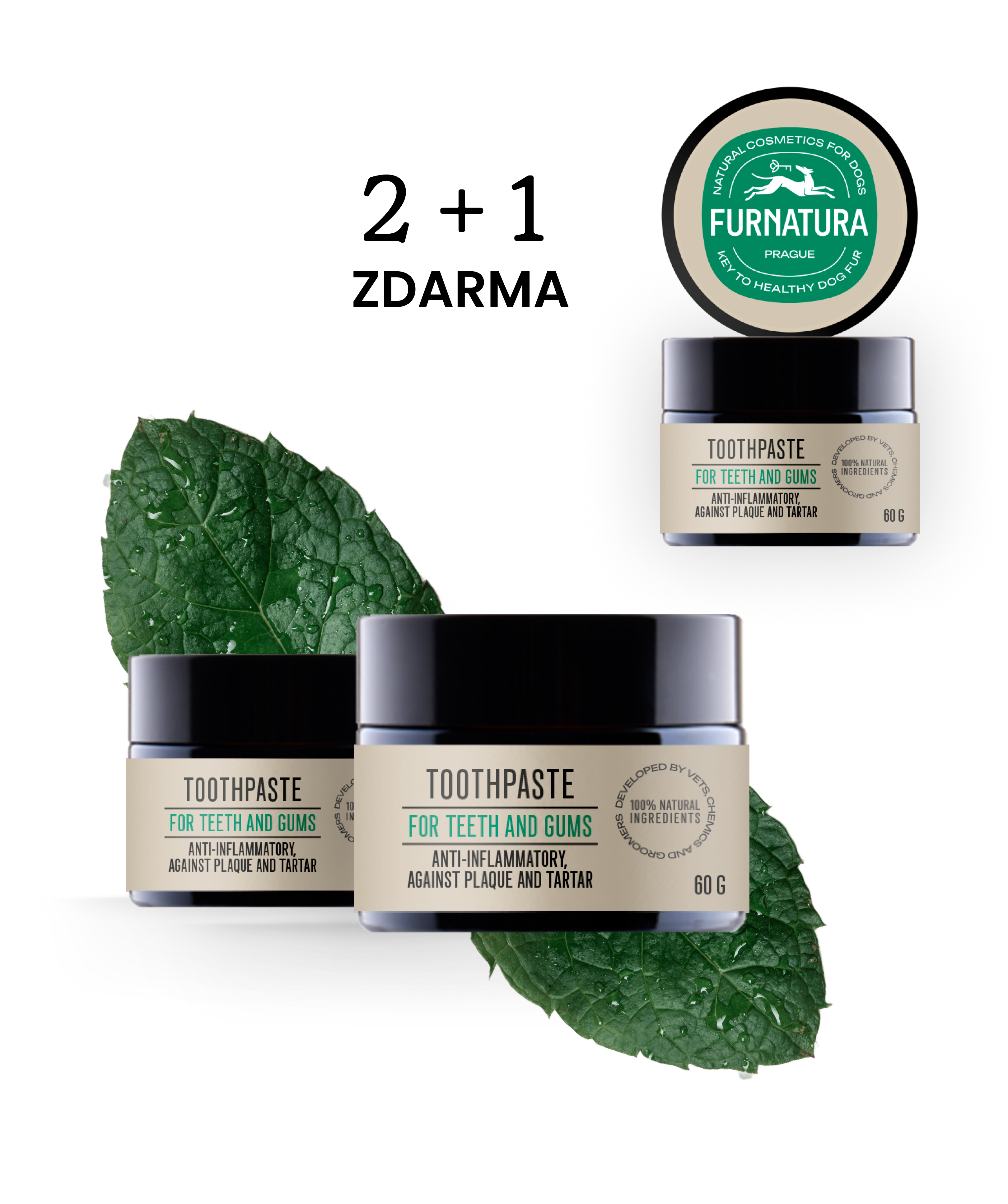 Přírodní zubní pasta pro psy Furnatura si hravě poradí se zubním plakem a nečistotami. Základem je jemně abrazivní kaolin, který šetrně čistí zuby a obnovuje přirozenou barvu skloviny. O dezinfekci dutiny ústní se postará kokosový olej a kurkuma – ta navíc působí proti zánětům a toxickým látkám díky vysokému obsahu antioxidantů.